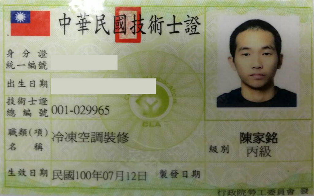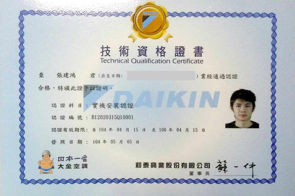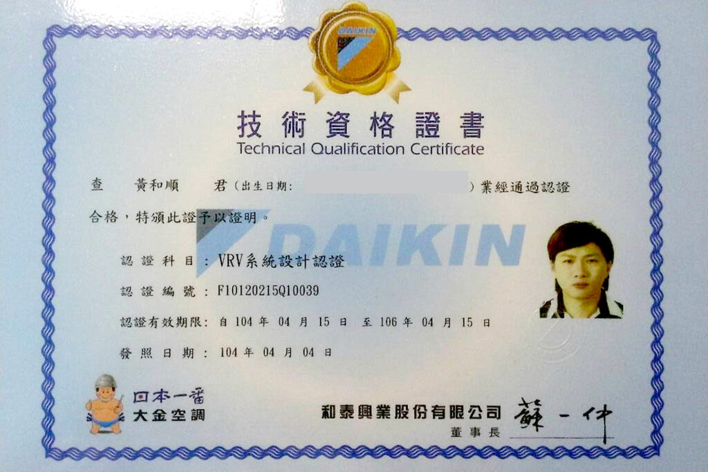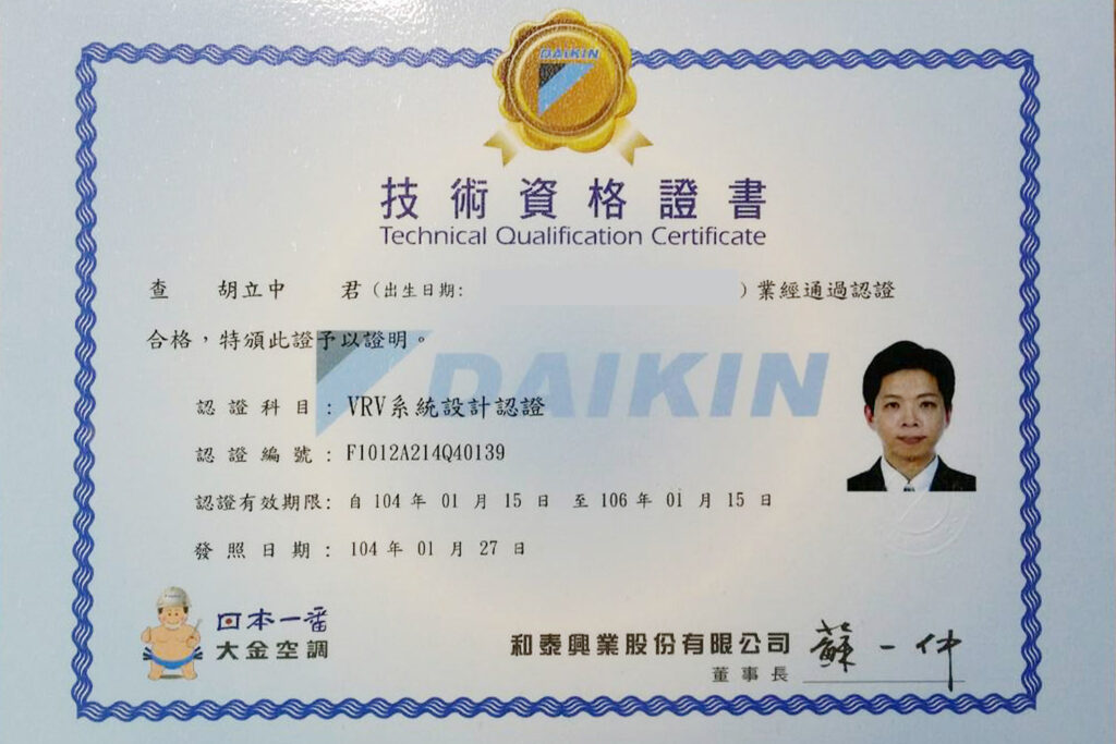 • (二)和泰興業股份有限公司(大金空調)直膨式系統施作基礎技能認證:通過人數2人